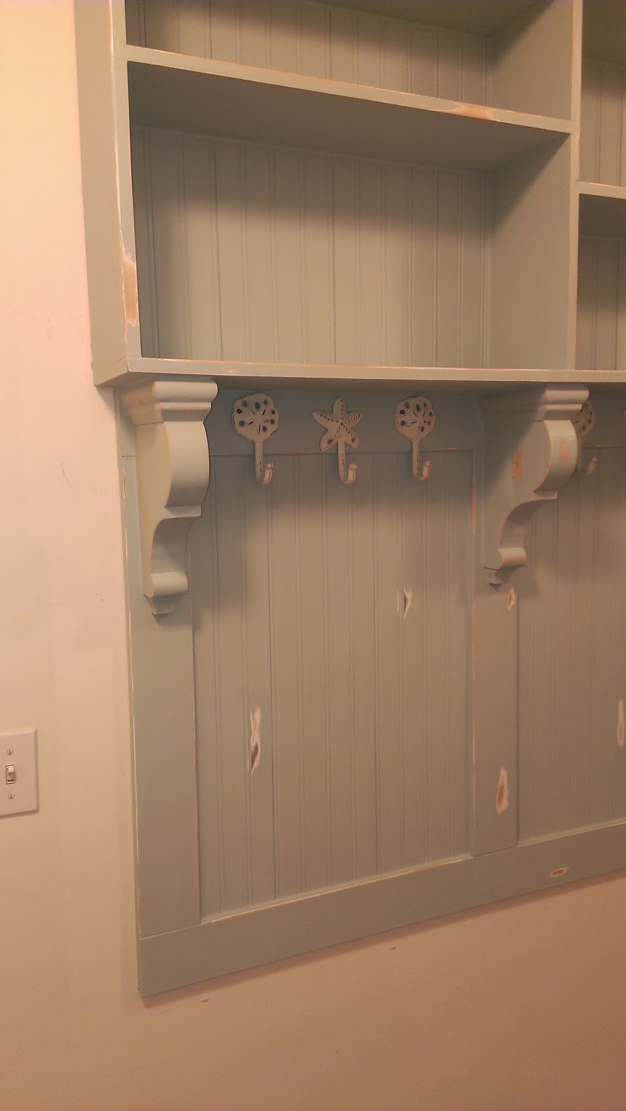 Paint choice: aqua, off white, aqua, brown, OK, aqua. The starfish & sand dollar hooks helped me make up my mind.